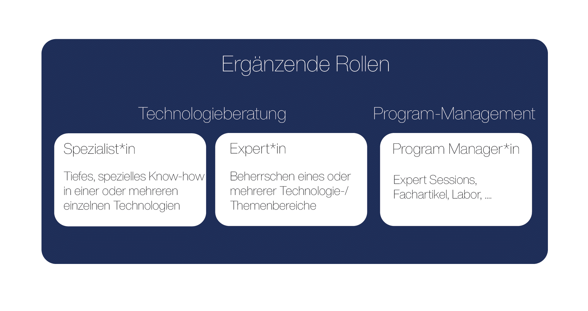 Du kannst bei uns außerdem folgende ergänzende Rollen in den Bereichen Technologieberatung und Program-Management einnehmen